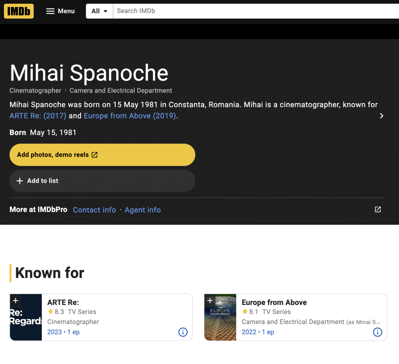 Filmeaza episodul Romania pentru National Geographic. Participa ca DoP in diverse filme documentare si promo-uri . Pasiunea pentru automatizari il face sa utilizeze usor camerele noi de la Sony Cinema precum si gimbal-uri, drone de mari si mici dimensiuni .